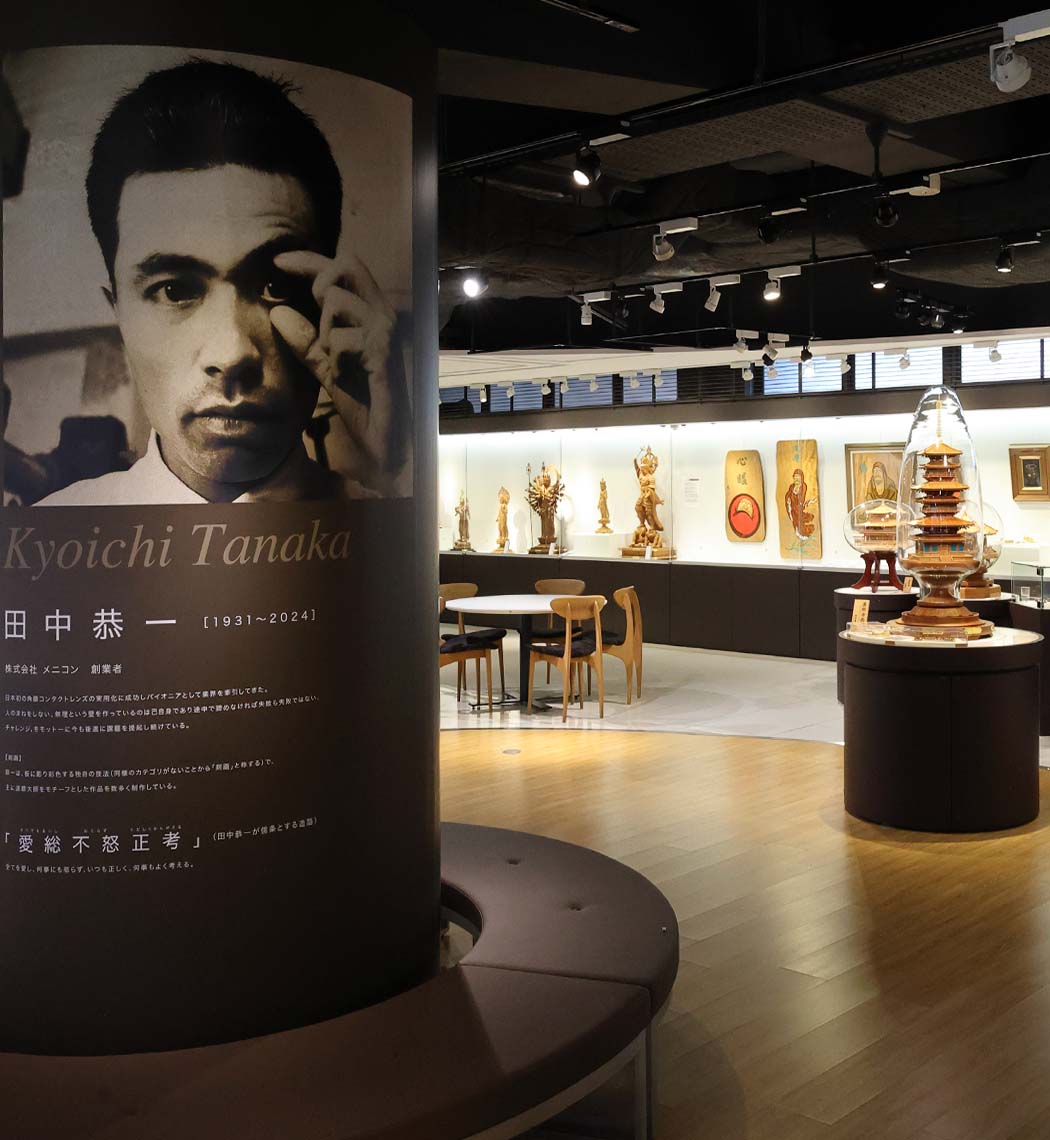 メニコン創業者・田中恭一の「刻画」、弟であり技術顧問を務める田中勇輝の「ボトルアーキテクチャ」の世界、そして二人の父である竹彫作家・田中華山が制作した作品の数々をご覧いただけます。