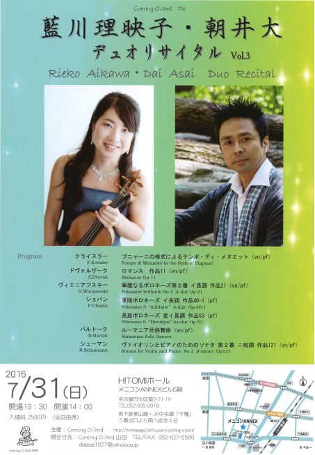2016年7月31日(日) 藍川理映子・朝井大デュオリサイタルVol.3